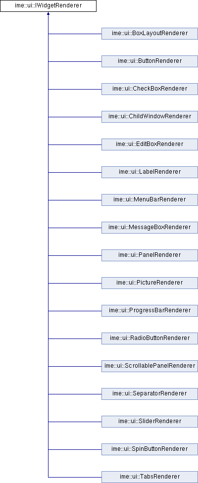 Implemented in ime::ui::TabsRenderer, ime::ui::SpinButtonRenderer, ime::ui::SliderRenderer, ime::ui::SeparatorRenderer, ime::ui::ScrollablePanelRenderer, ime::ui::RadioButtonRenderer, ime::ui::ProgressBarRenderer, ime::ui::PictureRenderer, ime::ui::PanelRenderer, ime::ui::MessageBoxRenderer, ime::ui::MenuBarRenderer, ime::ui::LabelRenderer, ime::ui::EditBoxRenderer, ime::ui::ChildWindowRenderer, ime::ui::CheckBoxRenderer, ime::ui::ButtonRenderer, and ime::ui::BoxLayoutRenderer.